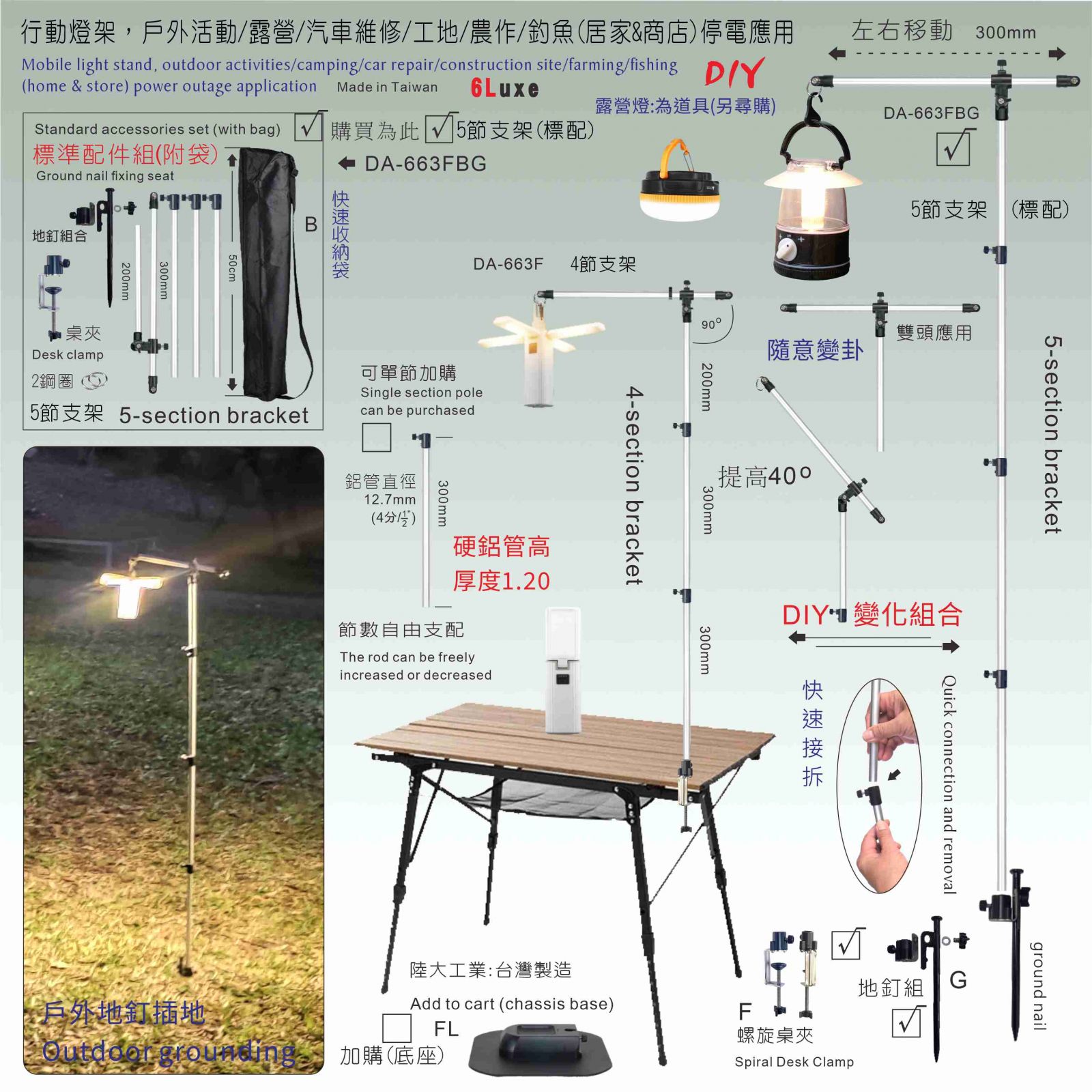 DIY aluminum pole (high thickness) quick connection and disassembly, four-section desktop lamp bracket/camping lamp stand/camping lamp post/camping lamp pole/lamp pole DA-663FB