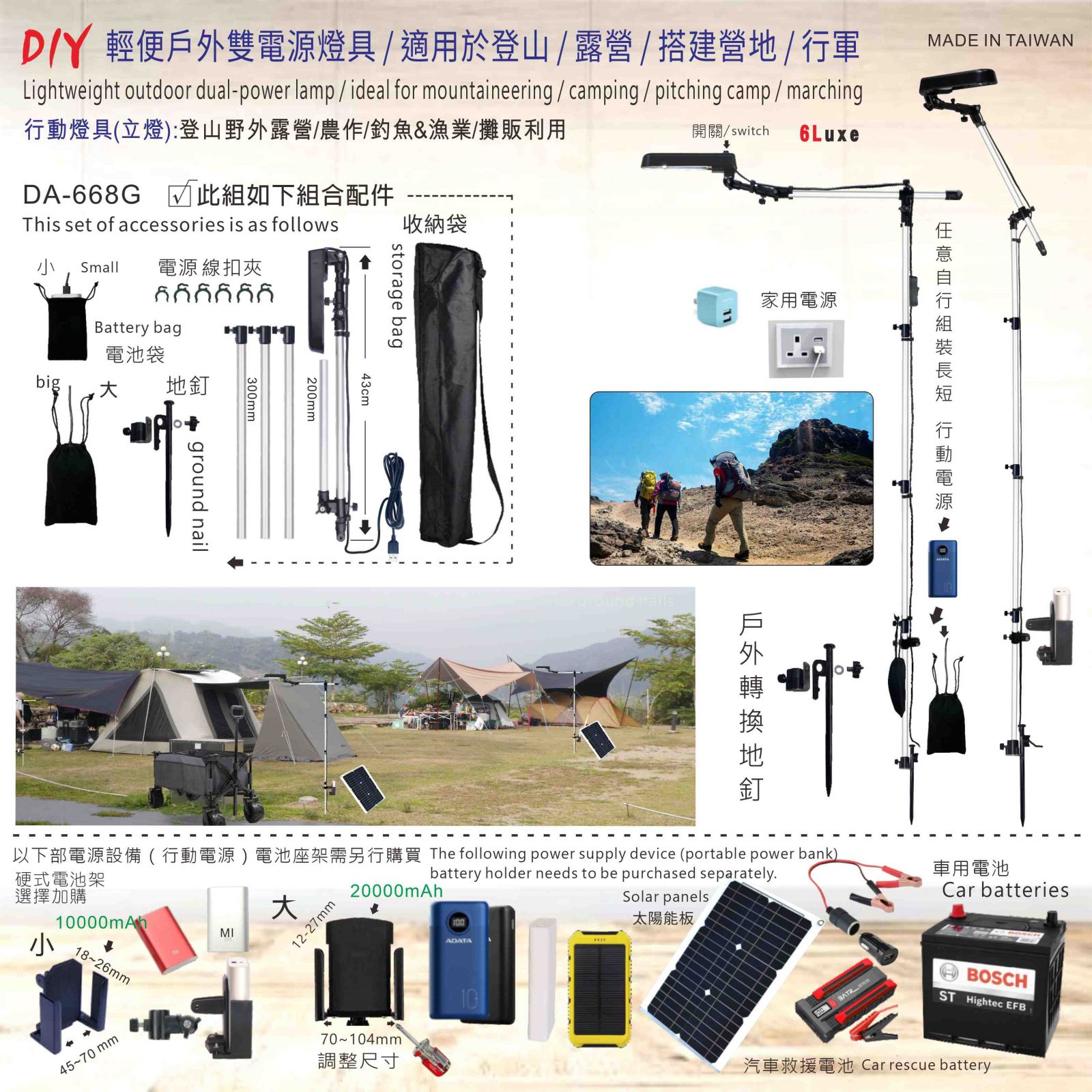 此燈具組合:主燈+地釘+雙電池袋+收納袋,(戶外活動&露營地應用) 停電無電, 室內&戶外應用(行動電源)10000 mAh(小)可亮度8小時/20000 mAh(大)可亮度15小時(小米行動電源測量), 自然光源(省電)